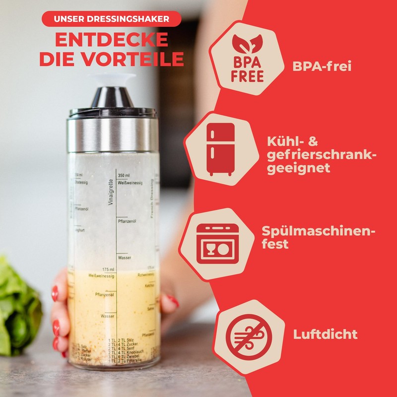 - Fresh and durability: our measuring cup is airtight sealable. This means longer shelf life and always fresh taste. Store your dressing directly in the shaker in the fridge.