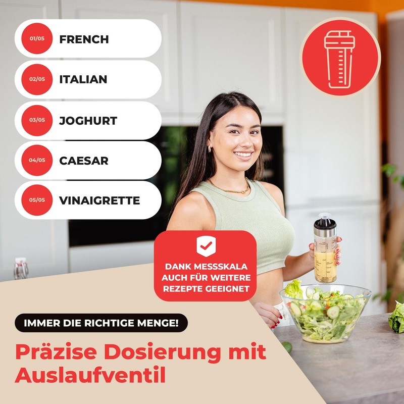 - Easy and quick to prepare: our salad dressing shaker allows you to prepare perfectly mixed dressings in seconds. Simply fill in the ingredients, shake and your dressing is ready.