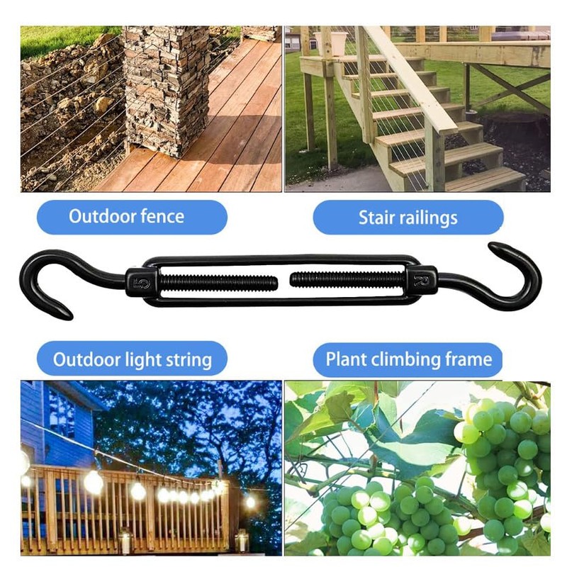 - 【Adjustable screws】: Our screw buckle hooks are designed with adjustable screw buckles at both ends, which can be adjusted according to the requirements of different projects. It is easy to use, simply twist to increase or decrease tension, and allows for cable tensioning, making it look tight and neat.