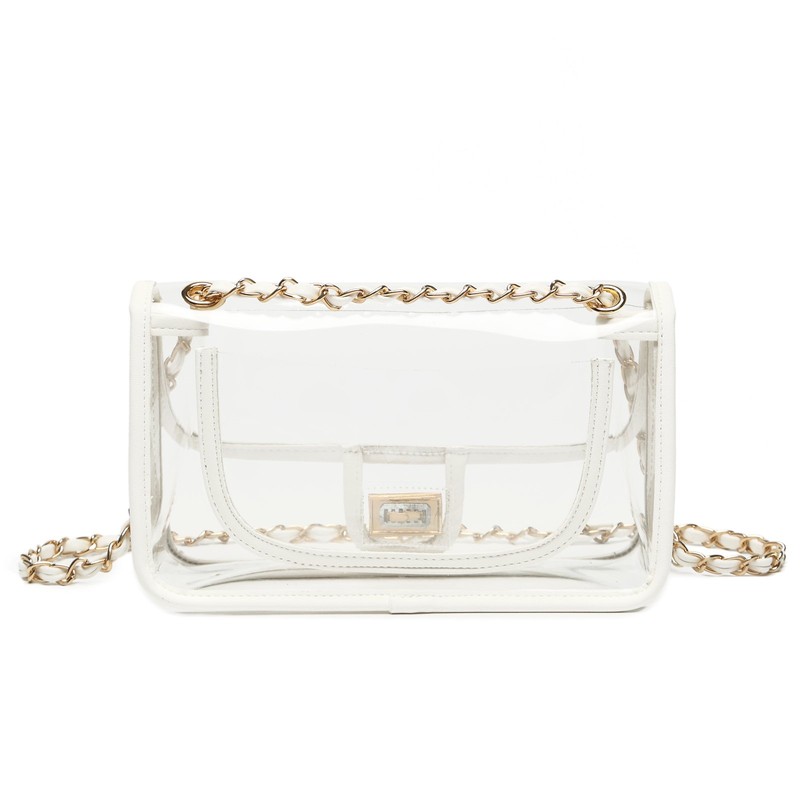 LAM GALLERY Womens PVC Clear Purse Handbag with Chain Stadium Approved Clear Bag See Through Bag for Working and Concert (White Gold Large)