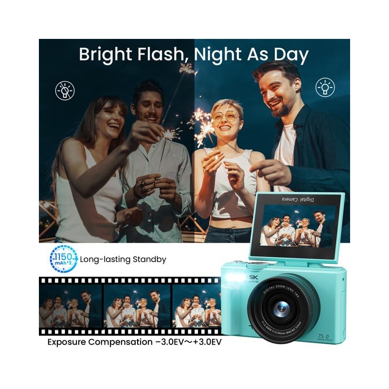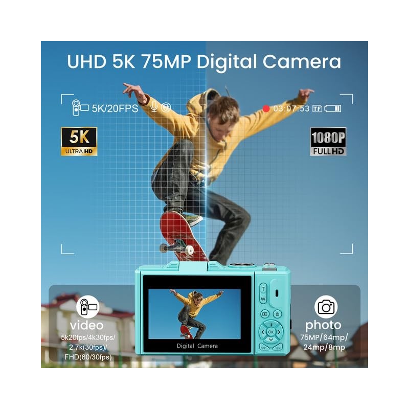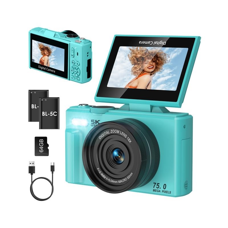 • UHD 5K and 64MP digital camera with 64GB SD card: the vlogging camera for YouTube can take 64MP images and record videos at 4K. The 3-inch ultra-clear screen supports 180° rotation, making selfies and self-blogging easier. The digital camera offers selfies, video pause function, recording while charging, slow motion recording and continuous shooting, which is better than conventional cameras.