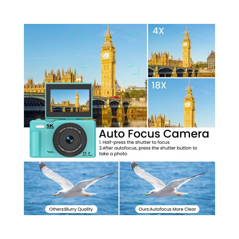 • 18x digital zoom and wide angle and macro lens: this compact autofocus camera supports 18x digital zoom, so you can easily capture distant objects. The wide-angle lens captures sprawling landscapes or large group photos, while the macro lens focuses on the tiny details of nearby objects. In addition, the built-in flash ensures that you can preserve these wonderful memories even in dark environments.