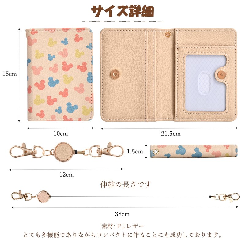 lamawin Pass Case with Reel for Women, Character, Cute, For Children, 4 Card Storage, IC Card Case, Bifold, Thin, Synthetic Leather, Stylish, Female ID Card Holder, With Elastic Reel, For College