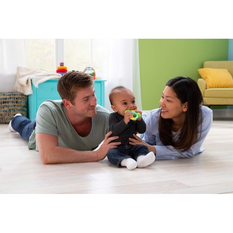 The corn teether has double benefits for baby: gentle vibrations from the corn cob will soothe gums, and by activating the massage mechanism when he bites, baby begins to learn cause and effect. The First Years' popular massaging teether concept takes on a unique farm theme with this John Deere design.