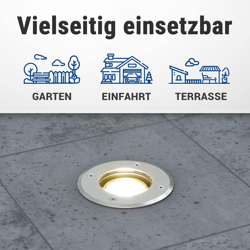 lambado® LED recessed floor spotlight for outdoor use, IP67, waterproof and drivable, including 3 W 230 V GU10 spotlight, warm white, round floor spotlight, stainless steel floor light for patio and