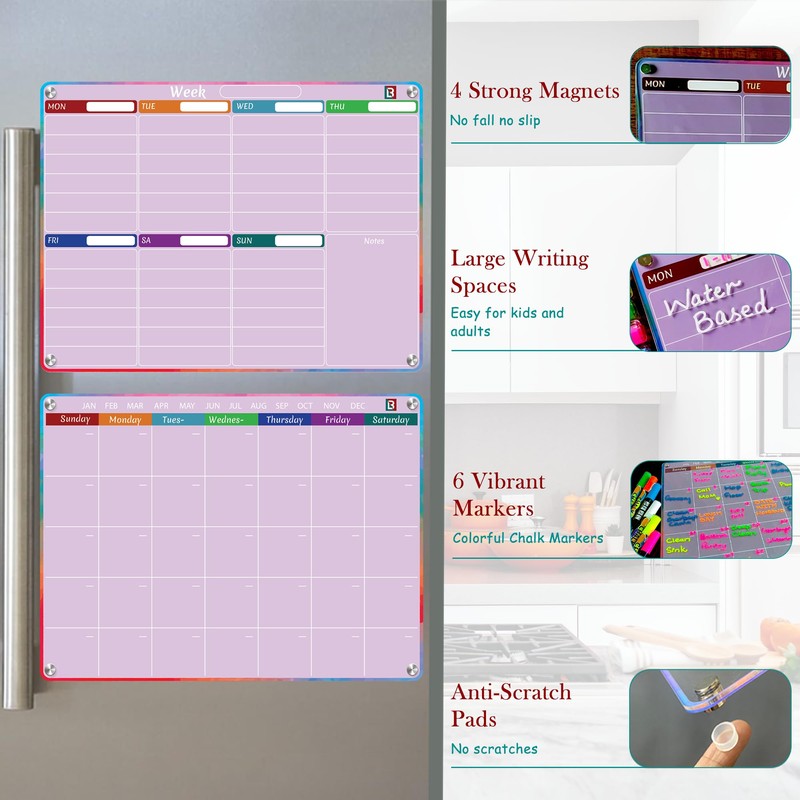 - ✳️【VALUE PACK | Ideal Gift】A complete set of Acrylic Calendars for Fridge includes | 1x Monthly Planner (12 x 16) in | 1x Weekly Planner (12 x 16) in | 6x Chalk Markers | 2x Magnetic Pen Holder (10 x 5) cm | 6 x Adhesive Wall Hooks | 2 x Cleaning Cloth | 1x Cloth Hanger | 16 x Anti Scratch Pads. Moreover, This Package comes in a beautiful white box, making it a versatile and practical gift for any occasion, ideal for enhancing productivity & goal achievement.