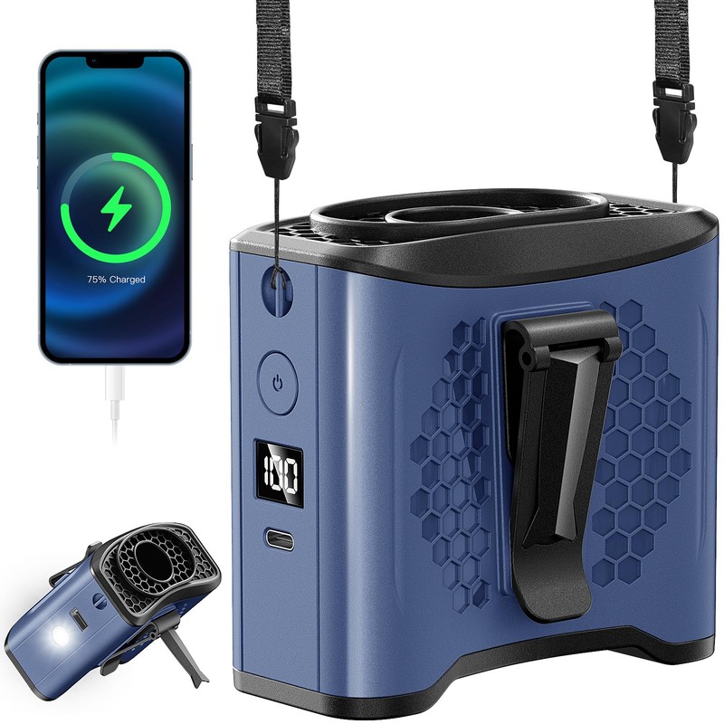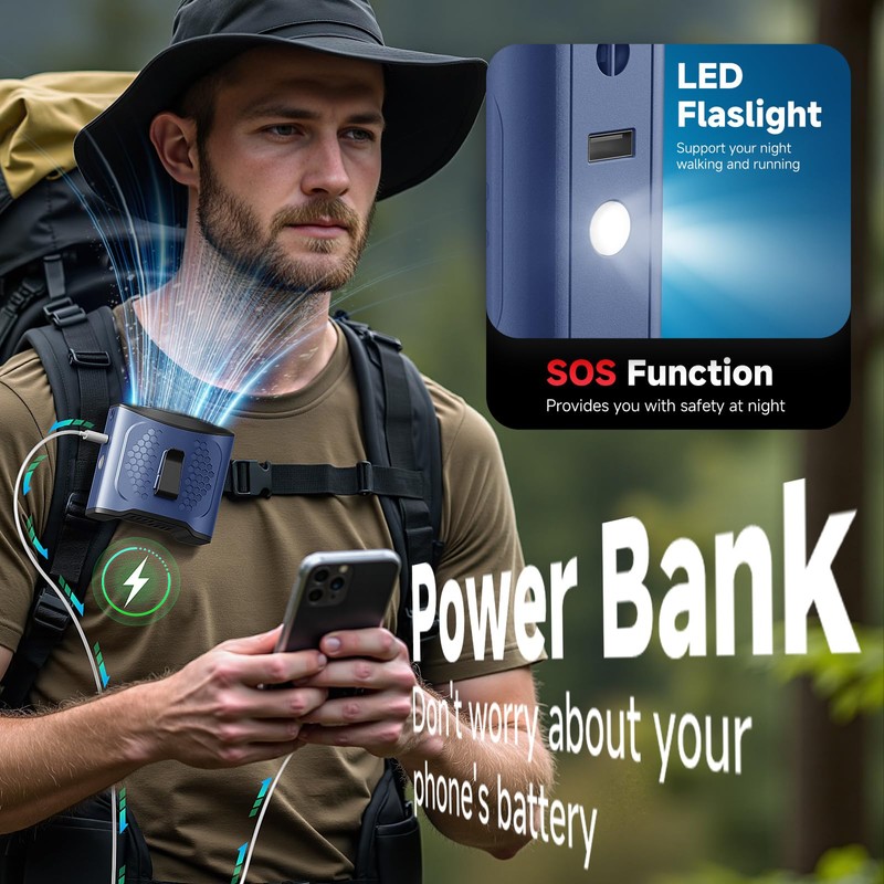 - 【5 in 1 Multifunctional Waist Fan】 This product is a waist fan, neck fan and desk fan in one, sturdy steel clip for use on belts, pants and shirts, lightweight and portable, freeing up your hands; with a desktop support, as a desk fan; it can also be used as an emergency mobile power device, charging your cell phone directly; built-in LED lights and SOS function, Provide illumination, meet outdoor and a variety of scene needs.
