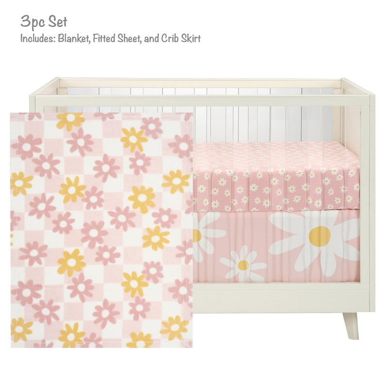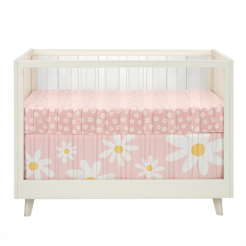 - Crib skirt is petal pink with various size white daisies