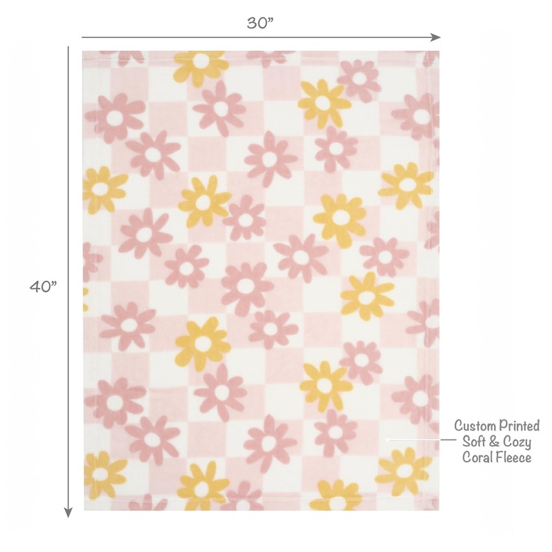 - Luxurious soft fleece blanket is on a petal pink and white checkered ground with rose pink and yellow daisies.
