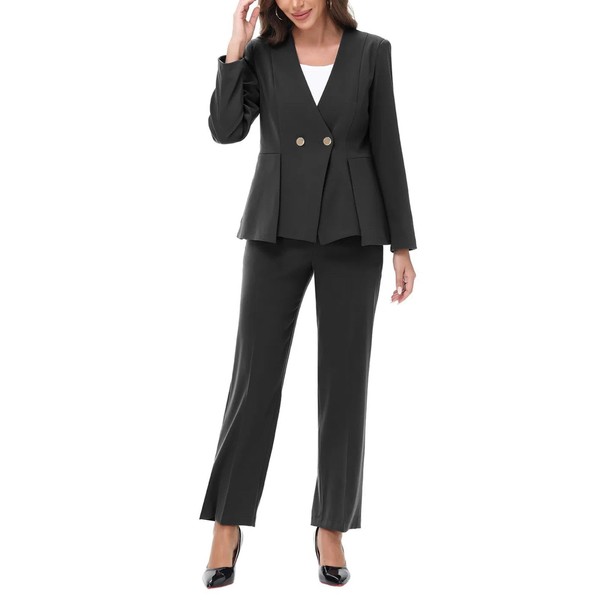 Lamgool Pants Suit for Women Dressy Casual 2 Piece Set V Neck Two Button Blazer Pants Set Business Casual Outfits(Black,L)