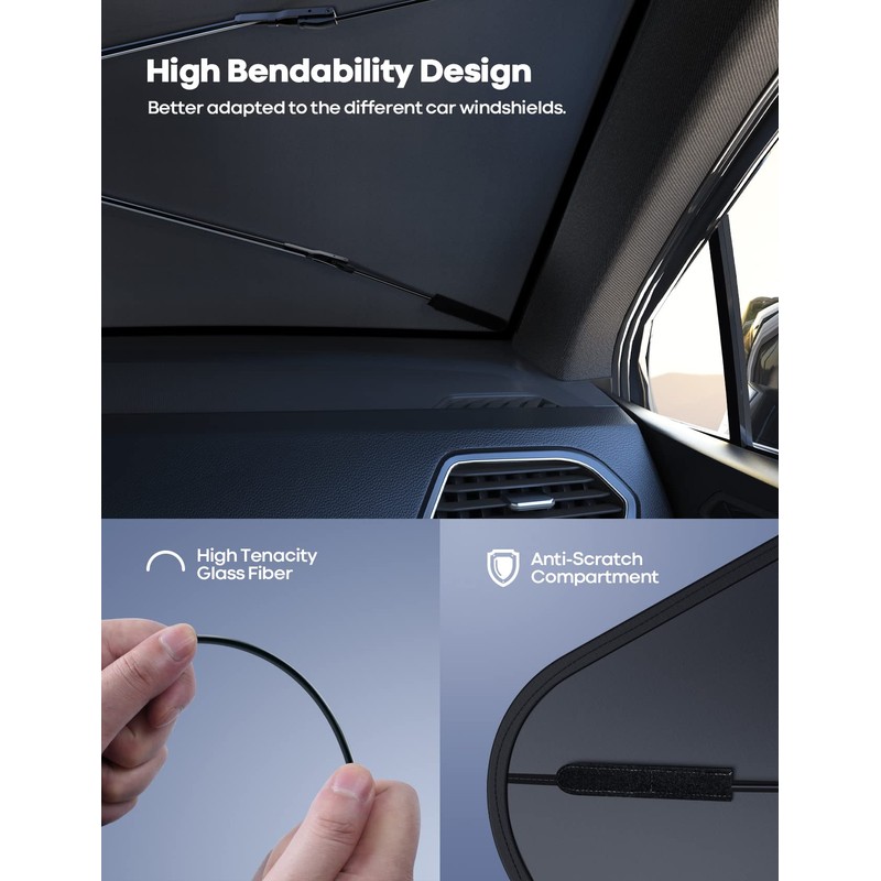 8 strong umbrella skeletons of the windshield sun shade umbrella is made of fiberglass material, and the umbrella skeletons can be bent 90 degrees without breaking and lightweight. The bendable umbrella frame can be adapted to different car of windshields by bending the umbrella skeletons.