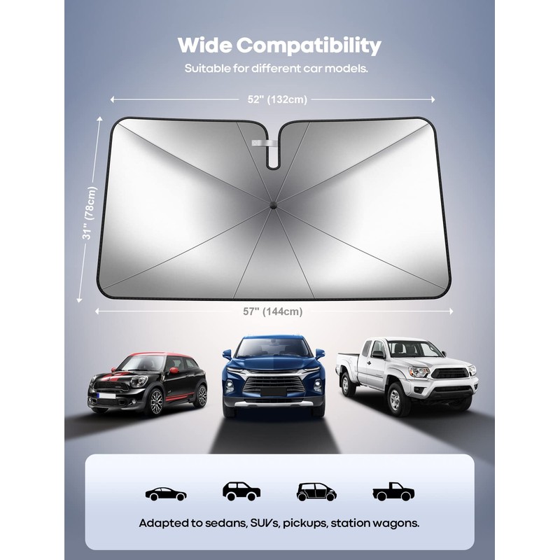 - 【 Universal Size】 With universal size of 31" (Wide), 52" (Top side), 57" (Bottom side), Can be adapted to more different models with bendable umbrella skeletons. ❗ Recommended to measure the size of your car windshield before order to check if it is applicable.