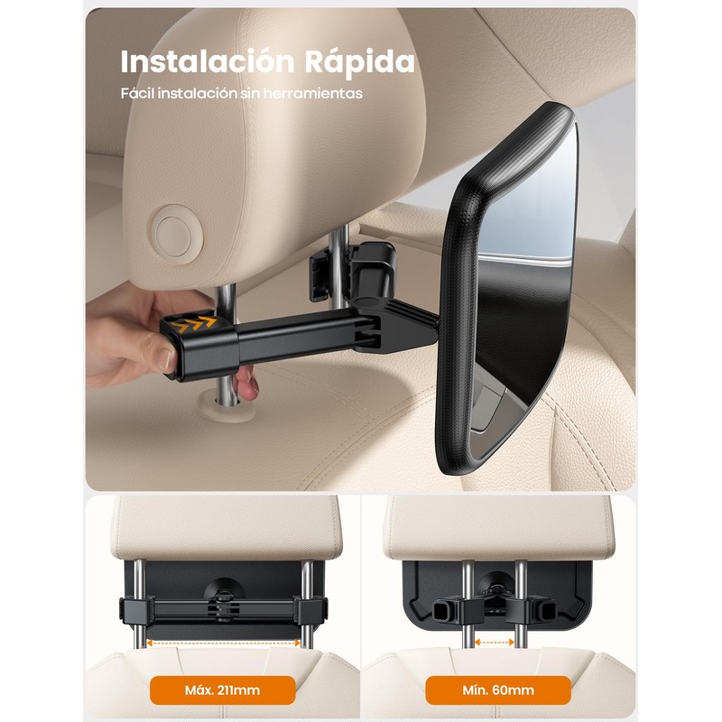 - 【3S Instalación con una Sola Mano】Simplemente presiona el enganche sobre el barrote del reposacabezas para instalarlo sin herramientas y tira del enganche para quitarlo. Es adecuado para reposacabezas con barras telescópicas (espaciado de las barras entre 2.36 y 8.31 pulgadas). Nota: Este espejo para asiento de bebé en posición hacia atrás no es compatible con los reposacabezas no telescópicos en modelos como Audi A4, A4L, Q3, Q2, Q2L; Tesla Model 3, Y, X, S; Peugeot 3008; Land Rover Discovery/Defender y Jeep.