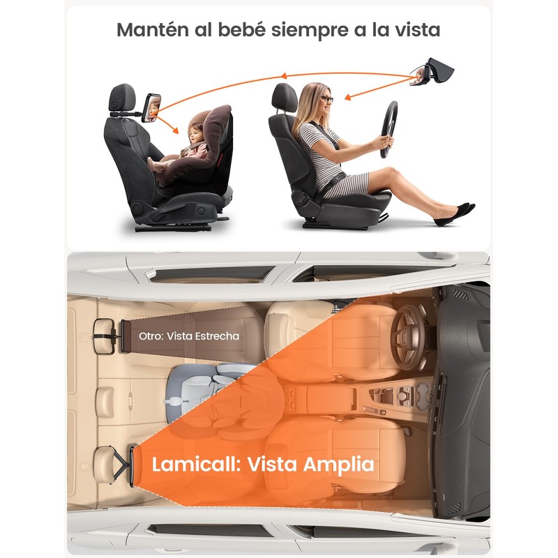 - 【Visión Clara y de 175° de Ángulo Ancho】¡Un espejo convexo de 175° de ángulo ancho que te ofrece una visión amplia para que siempre puedas ver a tu hijo! Garantiza una conducción segura mientras mantienes una visión clara de tu bebé en todo momento. El espejo para asiento de bebé en posición hacia atrás de Lamicall es un esencial articulos para bebe.