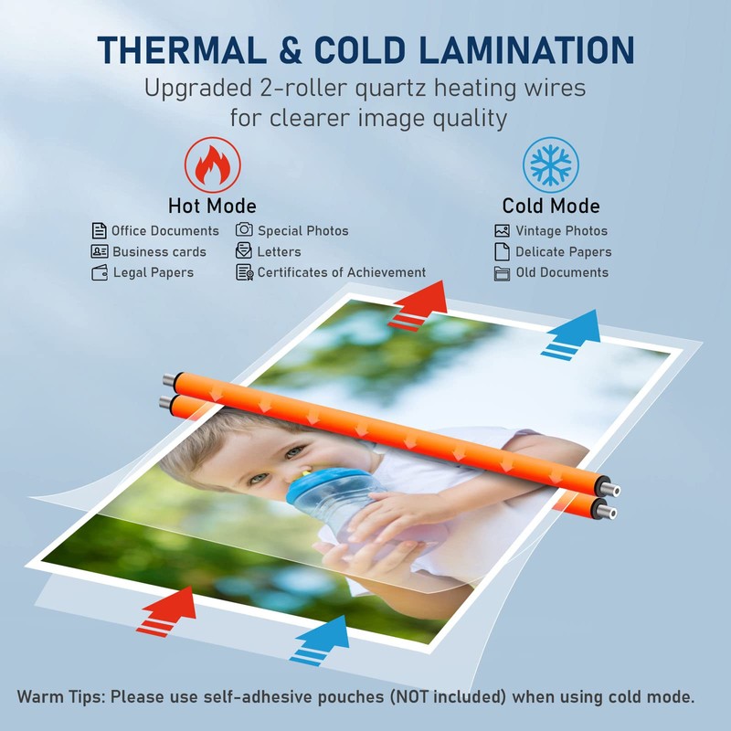 - ๐๐ผ๐น๐ฑ & ๐ง๐ต๐ฒ๐ฟ๐บ๐ฎ๐น ๐๐๐ฎ๐น-๐๐๐ป๐ฐ๐๐ถ๐ผ๐ป ๐๐ฎ๐บ๐ถ๐ป๐ฎ๐๐ผ๐ฟ: Built in a 2-roller heating system, supports both thermal and cold lamination. Compatible with any 3 mil and 5 mil thermal pouches, the machine is ideal for laminating photos, recipe cards, arts & crafts pieces, and more.