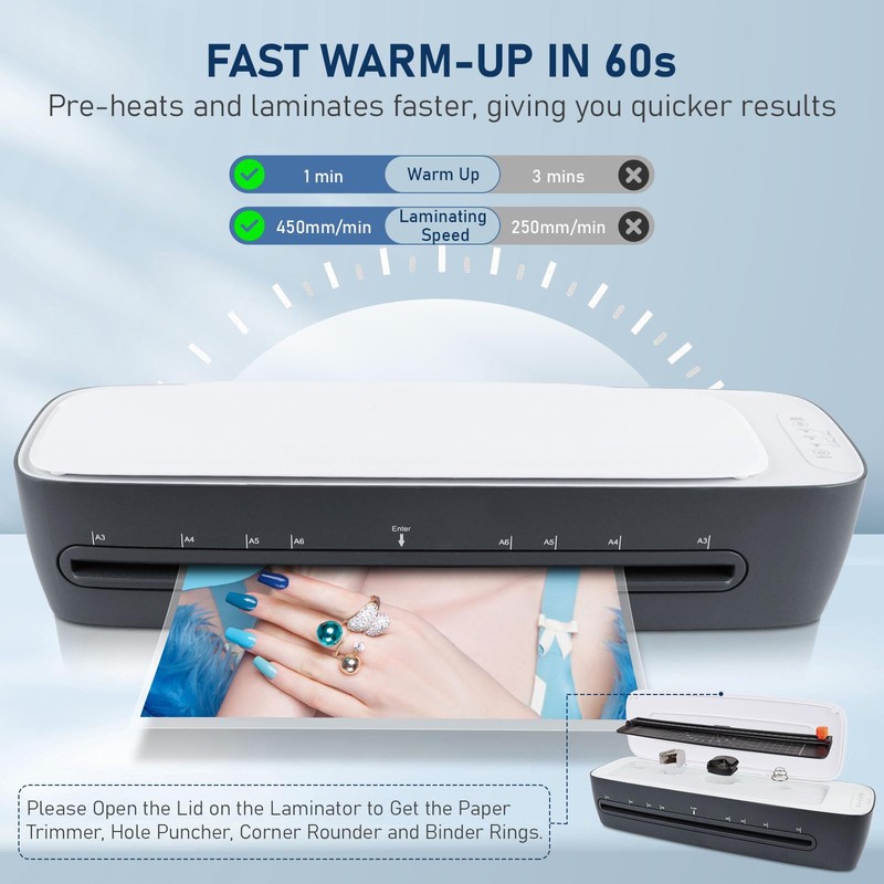 - ๐ฆ๐ฝ๐ฒ๐ฒ๐ฑ๐ ๐ญ ๐ ๐ถ๐ป ๐ช๐ฎ๐ฟ๐บ๐๐ฝ: Laminator warms up within 60s. It's quiet and has a laminating speed of 450mm/min while avoiding wrinkling, blistering, and curling after being upgraded. Acquire our faster preheating and higher laminating speed lamination machine to save your precious time.