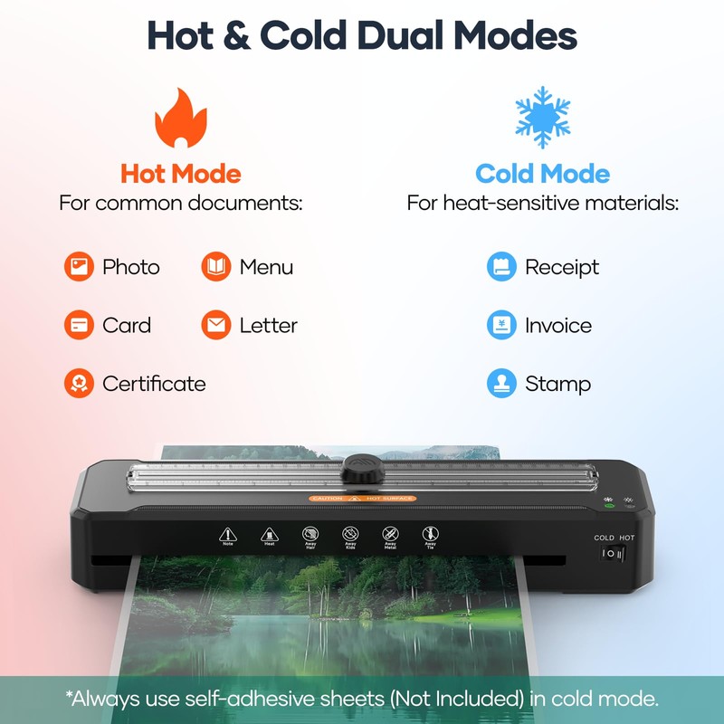 - 【Versatile Hot & Cold Laminator】The laminator features hot and cold lamination modes to fulfil more specific expectations. Hot mode is suitable for common documents, e.g. photos, menus, cards, certificates, cold mode is perfect for heat-sensitive materials, e.g. stamps and invoices. Please use self-adhesive pouches (Not Included) in cold lamination mode.