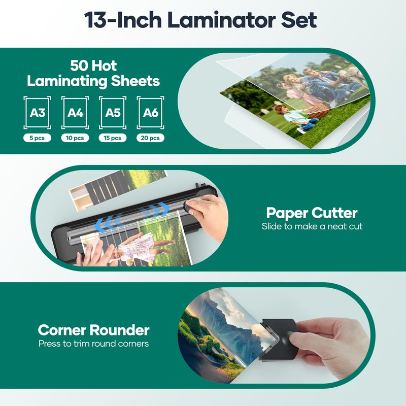Laminator Machine A3 with 50 Laminating Sheets, Laminator Thermal and Cold with Paper Trimmer Corner Rounder, High-Speed Jam-Free, Low-Noise 13-Inch Laminating Machine(Black)