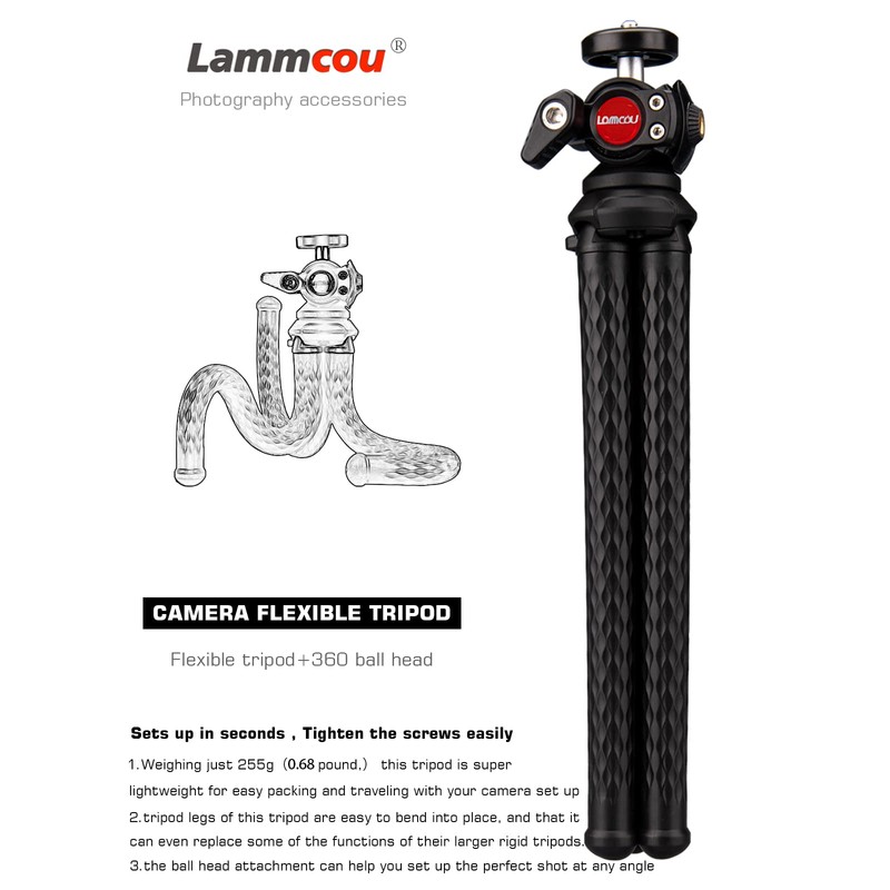 - Travel-friendly: Lammcou flexible tripod with a size of 11.02 inches and a weight of 280 g and compact, robust and lightweight construction, the Lammcou tripod fits easily in backpacks or bags of any size and is perfect as a travel tripod or second tripod when travelling.