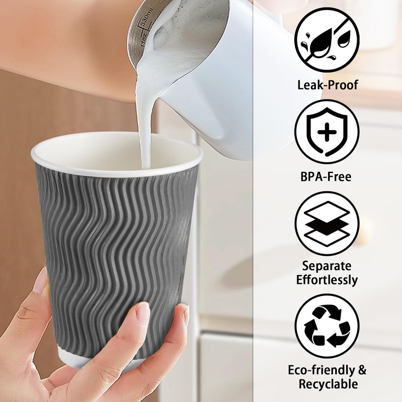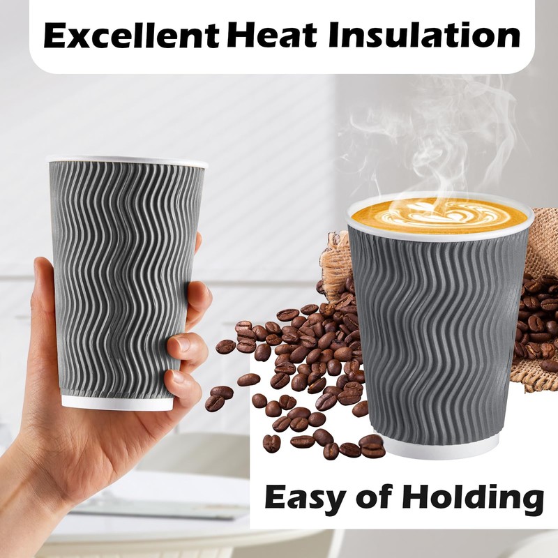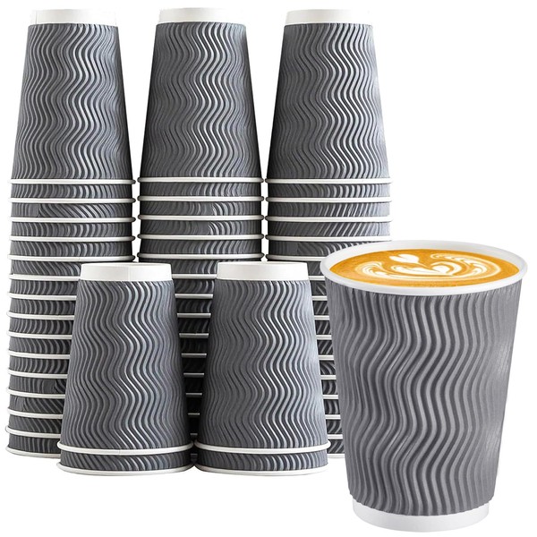 Lamosi 12 oz Insulated Coffee Cups Disposable - 50 Count Grey Paper Coffee Cups No Lids 12oz, Corrugated Ripple Wall Design for Hot Cold Drinks