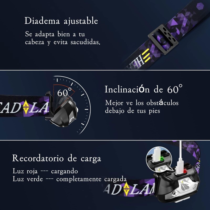 Lampara de Cabeza, Linterna Frontal LED Recargable, 5 Modos LED Lámpara Frontales con Sensor de Movimiento, IPX4 Impermeable Foco para Camping, Excursión, Pesca, Carrera, Ciclismo