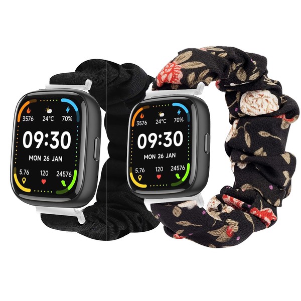 Lamshaw 22mm Fabric Elastic Scrunchie Elastic Women Cute Replacement Straps Compatible for Faweio IDW13/IDW16/IDW17/IDW19/IDW21/IDW26/Smartwatch (Black+Black Flower)