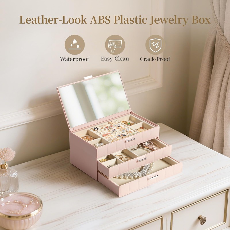 LAMU Jewelry Box for Women,Waterproof & Dustproof No Cracking Jewelry Case with Mirror,Imitation Leather Plastic Organizer for Earrings Rings Necklace Bracelet