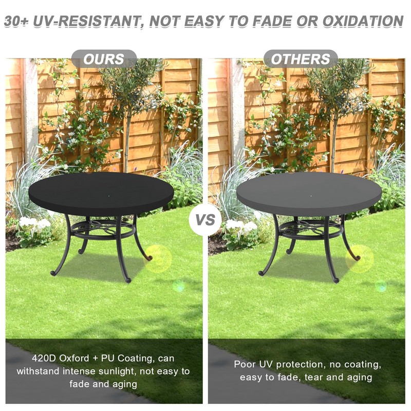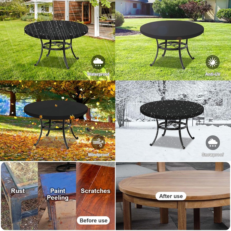 - Waterproof anti-UV garden table cover: LAMUNI table top protective covers are coated with thickened PU coating, this UV-resistant design can provide exceptional protection under the sunlight; extra waterproof tape is specially added to the top seams to prevent rainwater from entering. The year-round design provides your garden table with full protection from scratches, dust, moisture, rust, rot and mould.