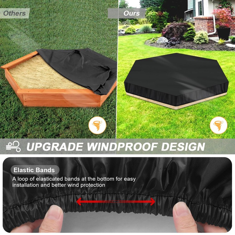 - ↪【Upgraded Windproof Design】Unlike the conventional drawstring hems, LAMUNI hexagonal sandpit cover features a special elasticated design with a loop of elastic bands at the bottom to ensure a customised look and snug fit, without the need for drawstrings. Special windproof design provides great stability in any weather and keep your sandpit in the best condition at all times.