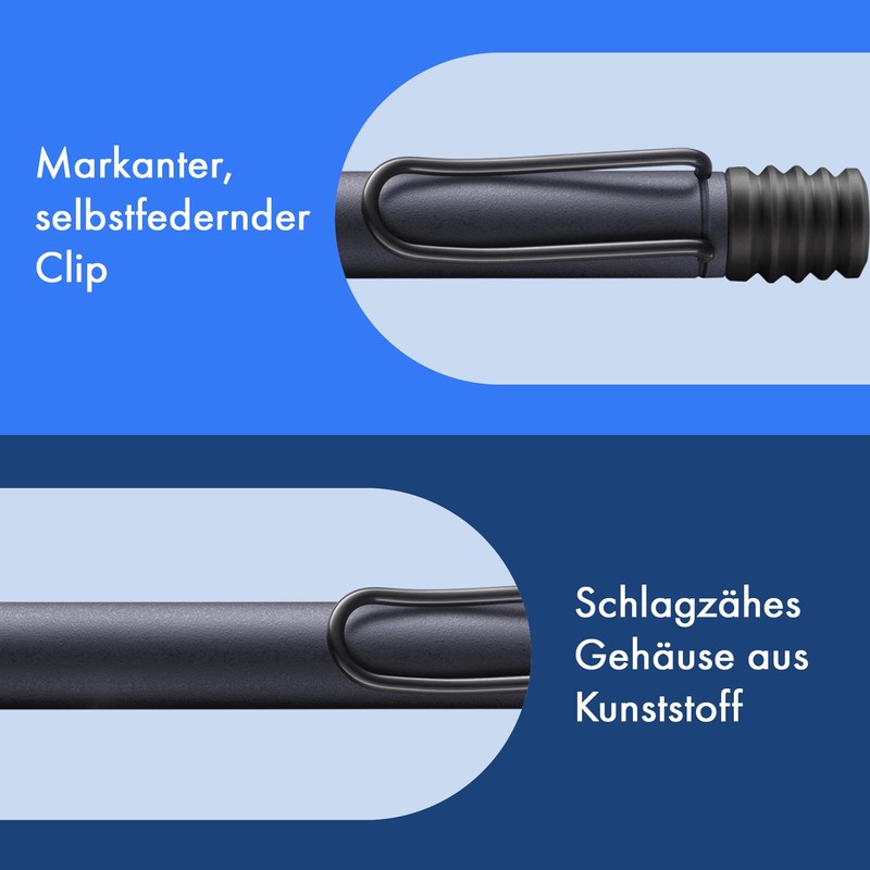 - Aesthetic, robust, individual: the Lamy safari ballpoint pen combines aesthetics, robustness and individuality. With its distinctive self-springing clip, durable ASA plastic housing and countless colours, it sets standards in everyday writing. As usual, the Lamy Safari ballpoint pen is manufactured to a high quality.