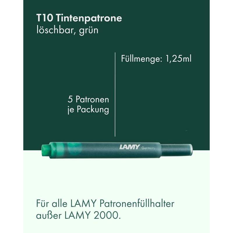 • Box contents: 6 x Lamy T10 ink cartridges in green – six packs of 5 each/contents: 1.25 ml