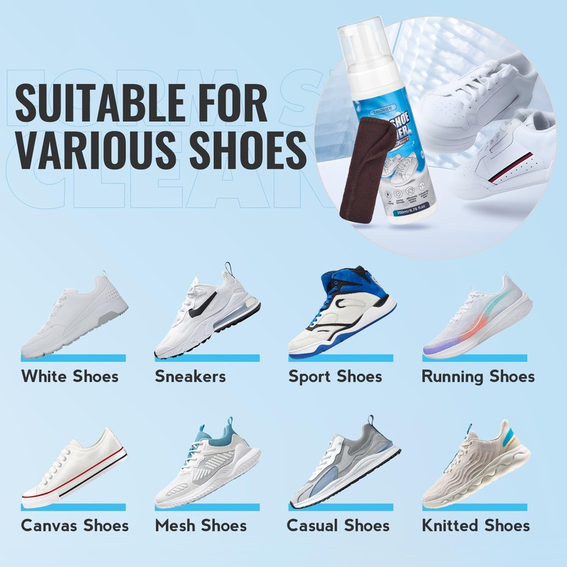 - Suitable for Various Shoes: Our white shoe cleaner is suitable for a wide range of materials and shoe types like sneakers, white shoes, running shoes, hiking boots, casual shoes, and more. Whether your shoes are made of suede, leather, PU, plastic, rubber, canvas, mesh, or other materials, our shoe cleaner meets all your needs.