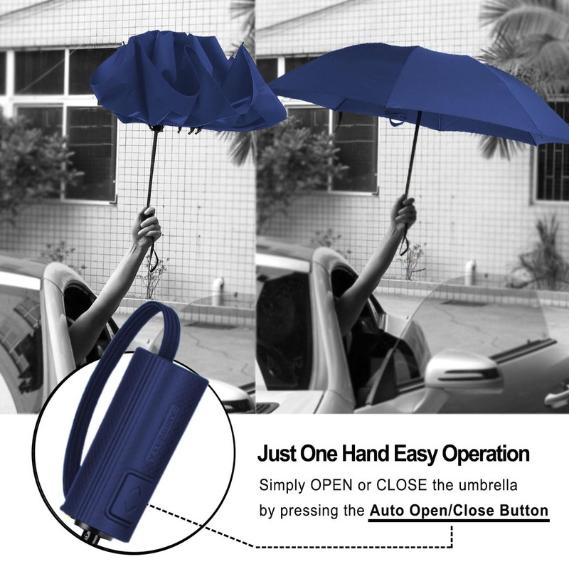 - CONVENIENT AUTO OPEN/CLOSE IN ONE SECOND: Just push the button once to automatically open and press again to instantly fold the canopy closed. You do not need to wait another second to open the umbrella when you get out of your car in the rain, especially in heavy rainfall, even when your hands are full of things.(Note: Untile the strap, and then SHAKE the umbrella to loosen the umbrella cloth is needed before you press button to open the umbrella.)