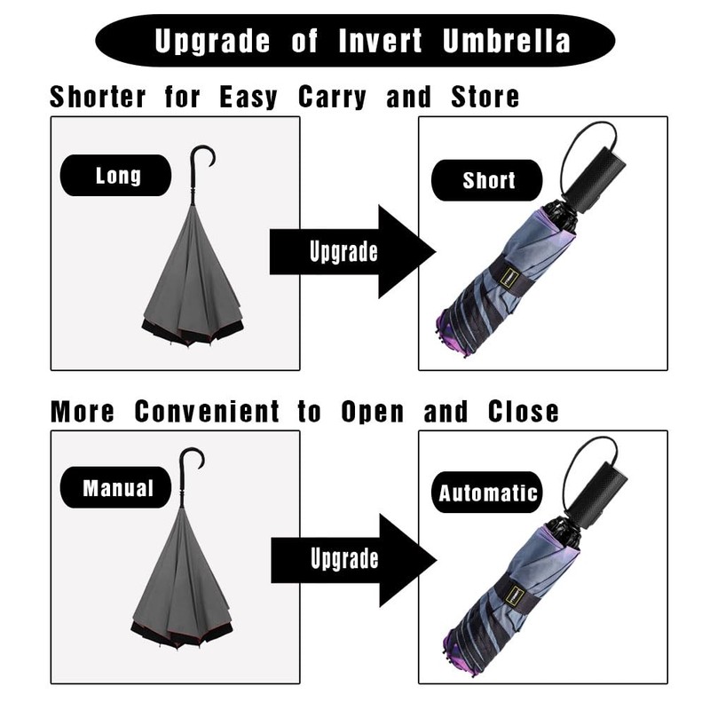 - COMPACT, PORTABLE AND EASY CARRYING: This is an upgrade design of the longer reverse folding umbrella, light weight and more easy carry. This reverse umbrella is easy to store in your car, your briefcases, backpacks, tavel bags etc. It is perfect for travel, business, camping, fishing, and daily use. Suitable for men and ladies.