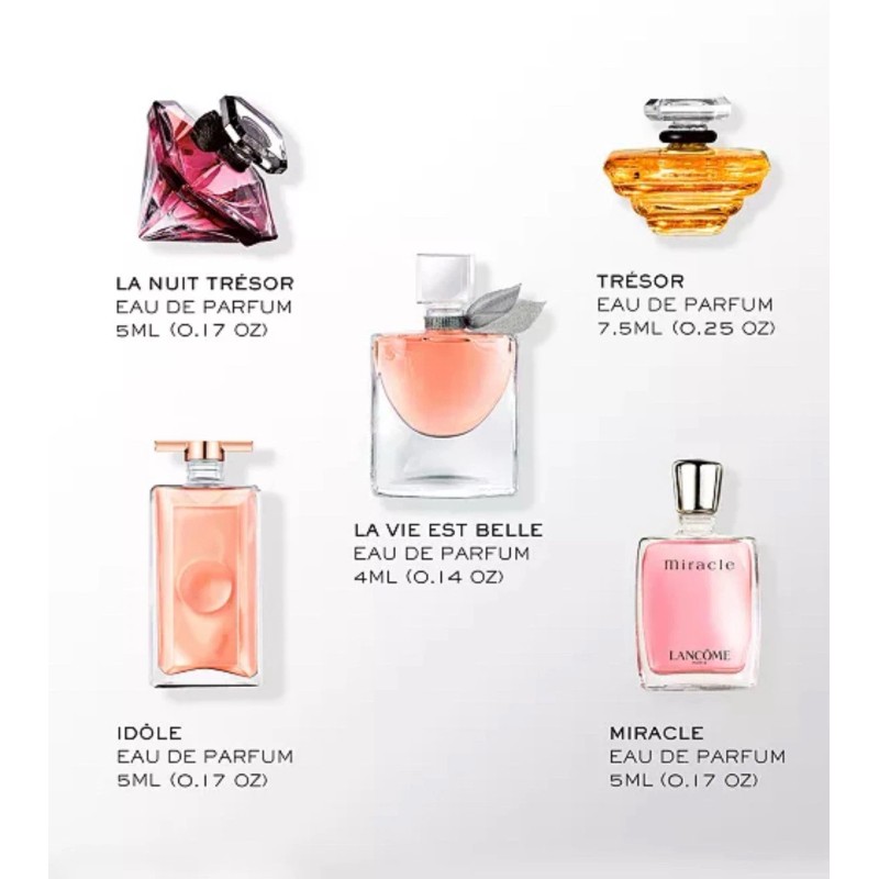 La vie est belle Eau de Parfum, 0.14 oz.; Idôle Eau de Parfum, 0.17 oz.; La Nuit Tresor Eau de Parfum, 0.17 oz.; Miracle Eau de Parfum, 0.17 oz.; Tresor Eau de Parfum, 0.25 oz.