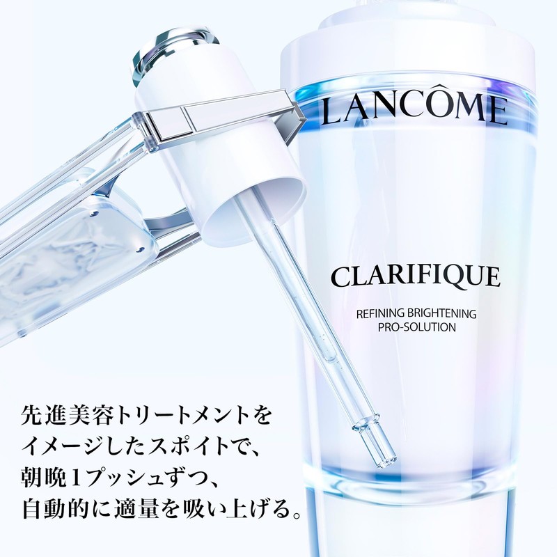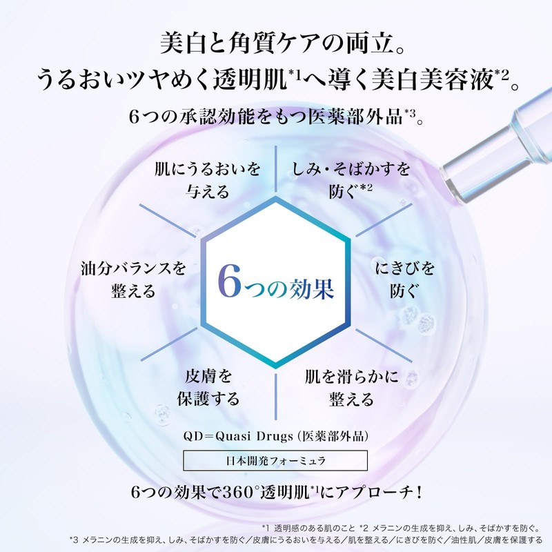 - Product benefit: 新世代*2「6QDx」*3美容液。 *2ランコムとして *3 6QDx: 6つの承認効能をもつ医薬部外品 (メラニンの生成を抑え、しみ、そばかすを防ぐ/にきびを防ぐ/油分バランスを整える/肌を整える/皮膚にうるおいを与える/皮膚を保護する)