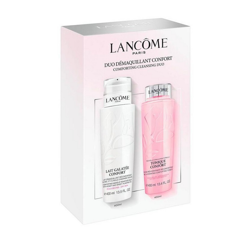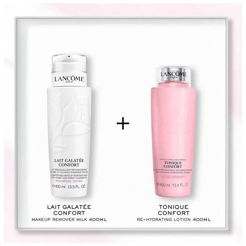Cleanse and tone to perfection with this Lancôme Lait Galatée Confort & Tonique Confort 400ml Set! Indulge your skin with the gentle and delicate Lait Galatée Confort 400ml facial cleansing milk and makeup remover by Lancôme. Specially formulated for dry skin, the instantly comforting face cleanser is enriched with honey, almond extract, cereals, yeast, and milk proteins. Galatée Confort leaves skin feeling instantly hydrated and silky-soft. Galatée Confort’s rich, creamy face wash leaves your skin moisturised, supple and smooth to the touch with no residue. Once cleansed, apply the Tonique Confort 400ml. Lancôme’s iconic ‘big pink’ lotion is their ultimate hydrating and comforting post-cleanse product. Enriched with Acacia Honey and Sweet Almond Oil, it removes any remaining impurities left over from cleansing and leaves the skin fresh, hydrated and comforted.
