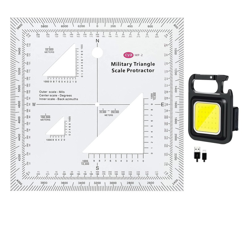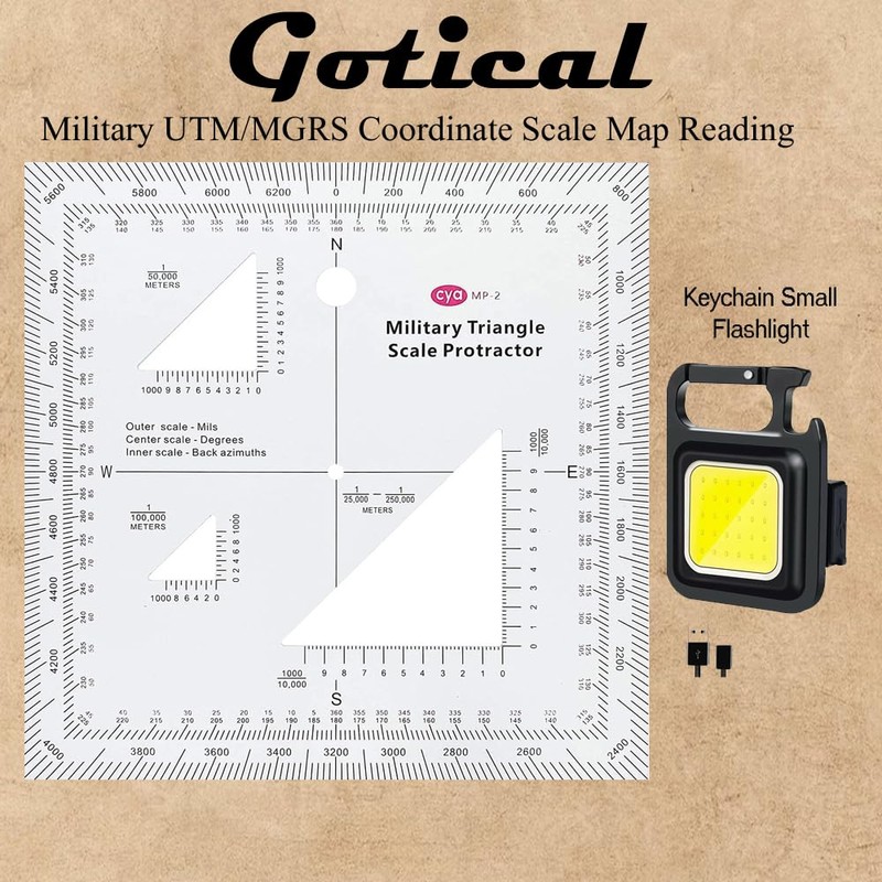 Land Navigation Topographical Map Scale & Small Flashlight 800 Lumens Bright, Led Mini Keychain Light USB Rechargeable & 1.2mm Transparent Plastic Military UTM/MGRS Coordinate Scale Map Reading