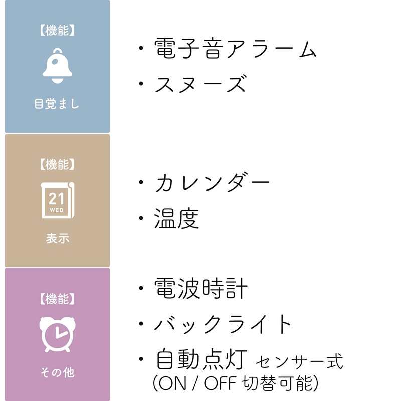 - Functions: Standard time radio wave reception function (automatic reception, manual reception) or manual time setting, electronic sound alarm function (1 piece), automatic alarm stop function (about 2 minutes), snooze function, thermometer, light steady on function, backlight (orange), auto calendar (January 1, 2016 - December 31, 2099)