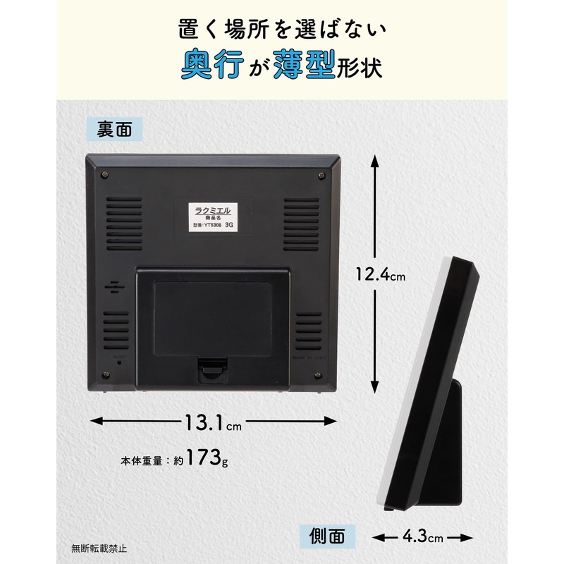 • Functions: Radio reception function (automatic reception / manual reception), auto calendar (until December 31, 2099), temperature display, humidity display, light, electronic sound alarm, battery replacement notification