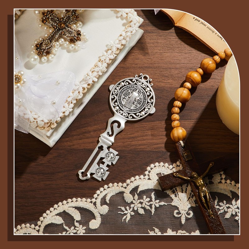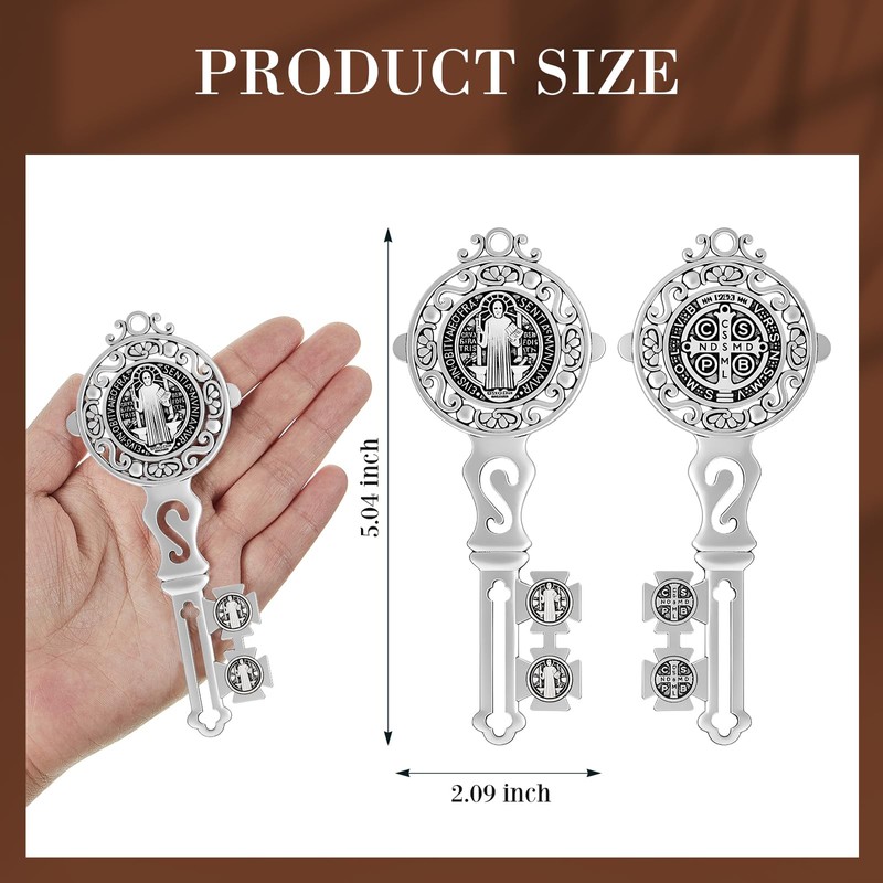 • Attractive and Vintage Look: the saint benedict keys are crafted with intricate, embossed patterns presenting a vintage look; They are also adorned with engravings in Latin, appealing to those with a taste for vintage aesthetics