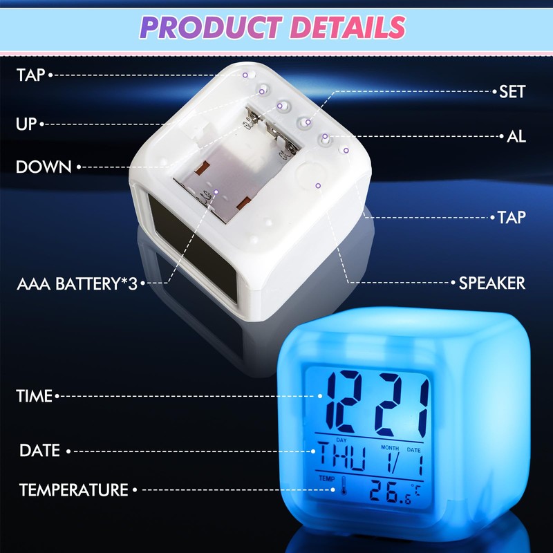• Color Changing and Night Light Feature: this digital alarm clock also doubles as a night light that can change between 7 colors, creating an enchanting ambiance for any space, suitable for multiple scenarios, from being a comforting bedside presence to a more soothing bedtime atmosphere at your parties