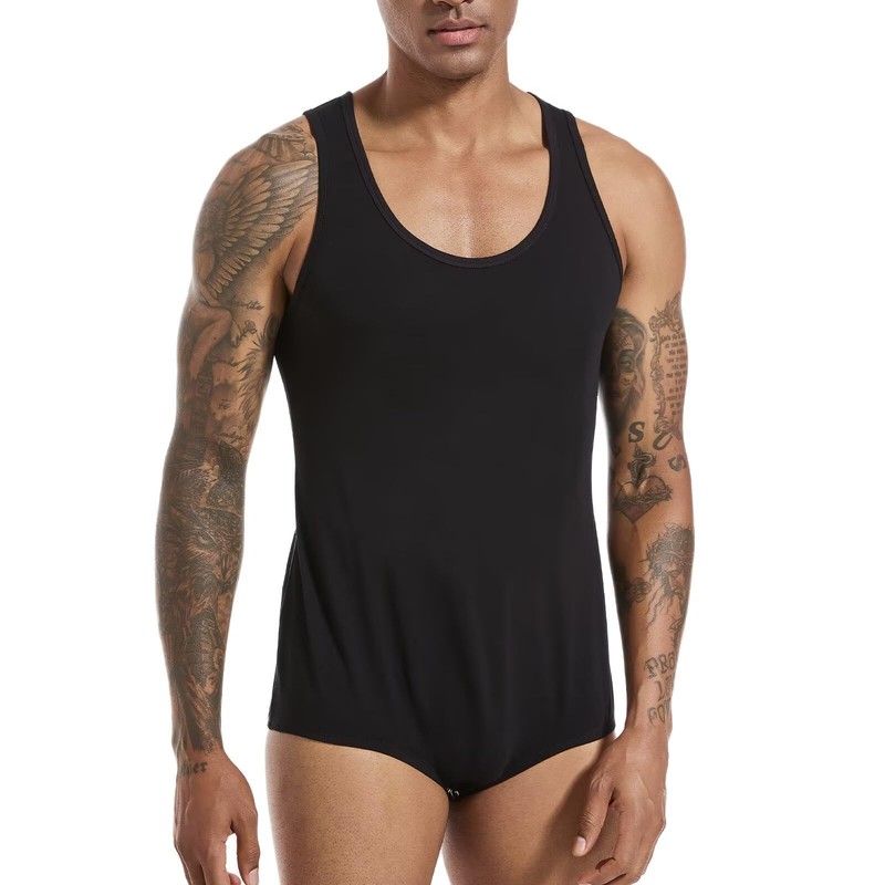 Landofgenie Men's Cotton Sleeveless Romper with Snap Crotch Solid Colours Bodysuit One Piece Pajamas Undershirt Black 3XL