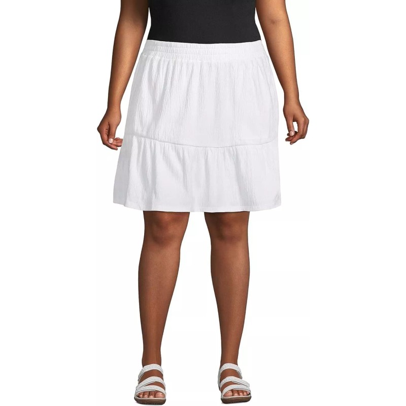 - Quality materials: Light and breezy this Women's Plus Size High Rise Pull On Elastic Waist Tiered Crinkle Knit Skirt is perfect for hot days. 96% cotton/1% spandex/3% other. Machine wash.