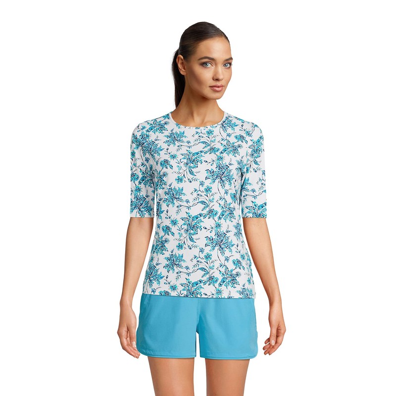 Lands' End Womens Elbow Sleeve Crewneck Swim Tee Rash Guard White/Turquoise Jacobean Regular X-Small