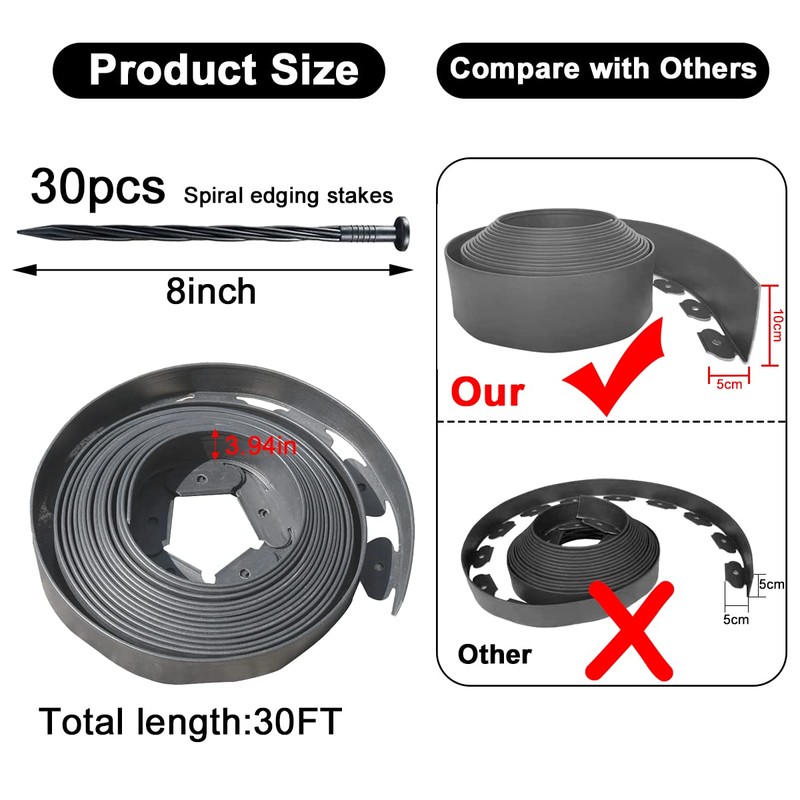 - Size:Landscape edging is 33ft length & 4in height; with 30pcs 8-inch spiral spikes.