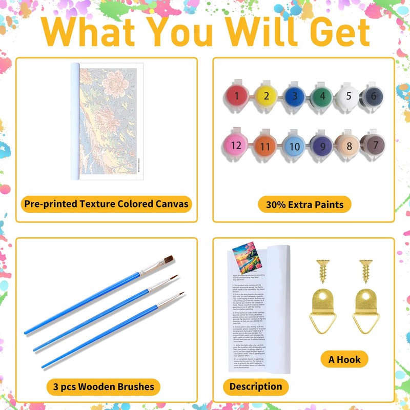 This paint by numbers kit includes a pre-printed canvas and instructions, a set of brushes, a set of acrylic paints, and a wall hanging to display your finished work. The canvas is marked with numbers that correspond to the color of paint that should be applied to those areas, making the painting process simple and convenient.