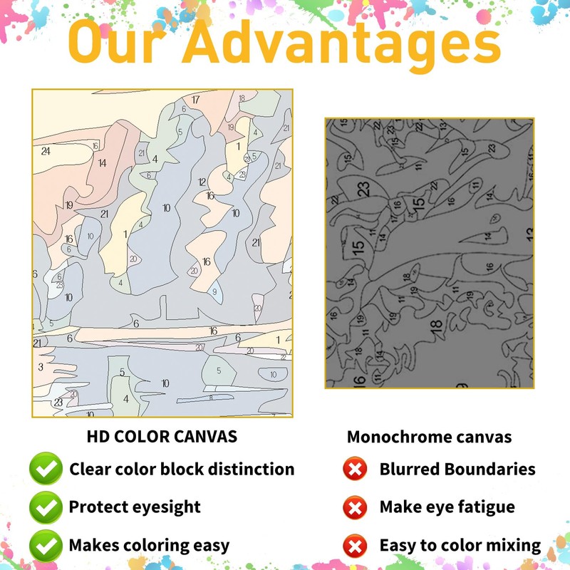 - 【HD Color Canvas】 Our yinyan painting by number uses HD color canvas, which is different from other monochrome canvases. Our digital areas are easier to distinguish and paint is easier to adhere to them. The color canvas can prevent eye fatigue and make painting easier.