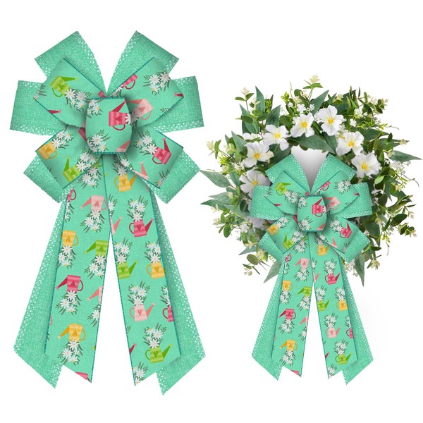 LANGFON Large Spring Wreath Bow Linen Flower Bows Green Spring Flower Ribbon Bows for Wreath Watering Can Flower Decor Bow for Spring Summer Party Indoor Outdoor Tree Topper Wreath Decoration Supplies