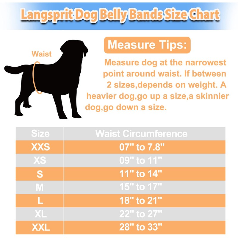 - Sizing - The 3 pack of male belly bands for dogs come in 7 different sizes to fit most dogs (From XX-Small to XX-Large). For a list of sizes and measurements, please go to the product picture area to find the sizing chart.